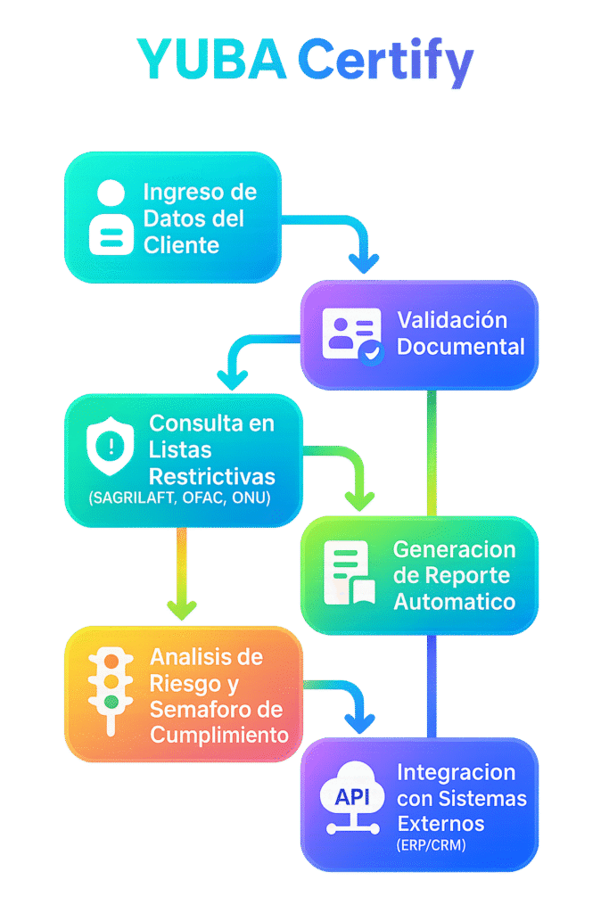 Con YUBA Certify ofrecemos un sistema avanzado de consultas SAGRILAFT ,verificación documental, listas restrictivas y monitoreo constante con reportes en tiempo real que permiten a tu empresa mitigar riesgos legales, financieros y reputacionales.